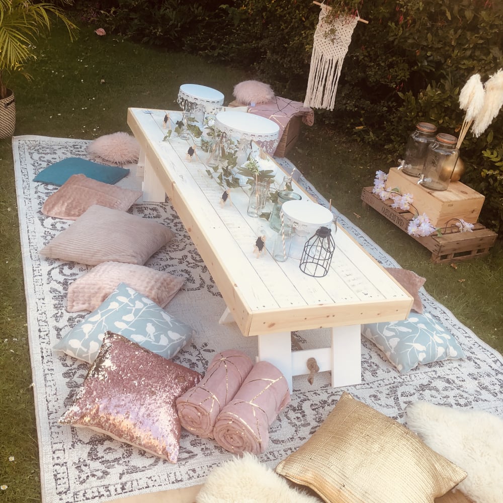 Champagne Flute Tumbler. Boho style low profile picnic tables sit 4 people per table. Our aim is to create an affordable yet luxurious event with any backdrop.
